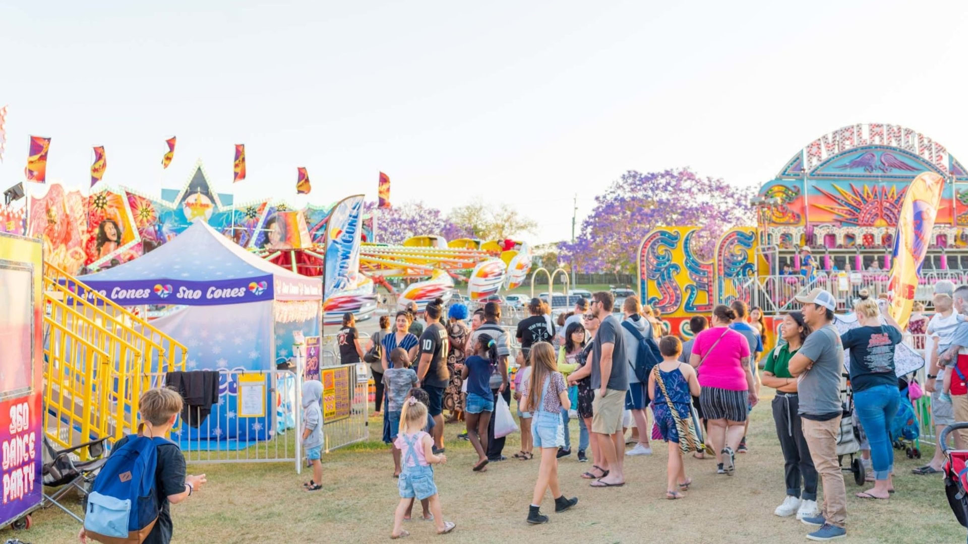 This 2025 Goodna Jacaranda Festival program includes sideshow alley, performances by local musicians and school students as well as food trucks, market and community stalls and fireworks.