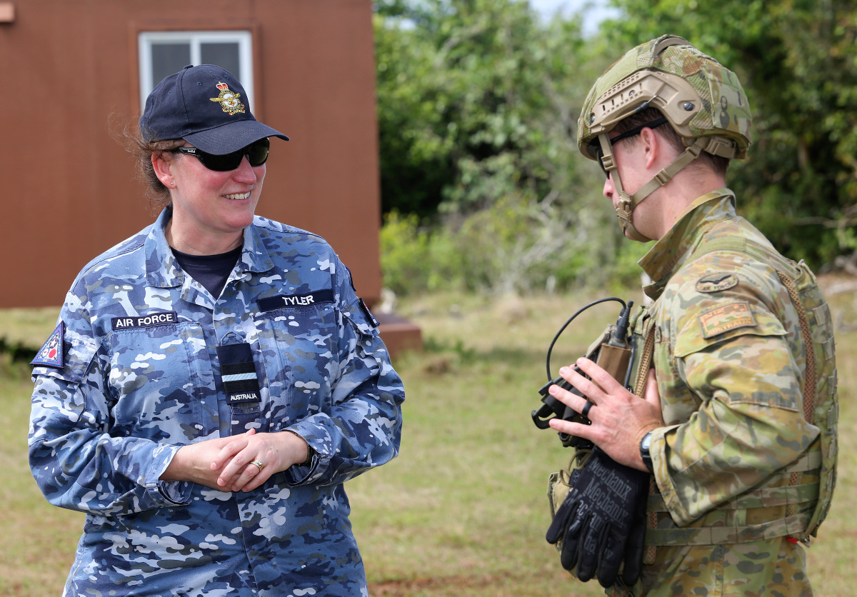 (l-r) Royal Australian Air Force (RAAF) Commander Combat Support Group, Air Commodore Veronica Tyler, speaks with RAAF No. 1 Security Forces Task Unit Commander Squadron Leader William Drewitt-Smith, about the security training being conducted at the Commando Warrior Training Facility, Andersen Air Force Base, Guam. Images courtesy: Defence